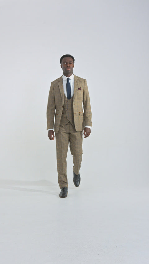 Herrenanzug, 3-teilig, Fischgrätenmuster, Tweed, hellbraun, kariert, maßgeschneiderte Passform, doppelt klassisch